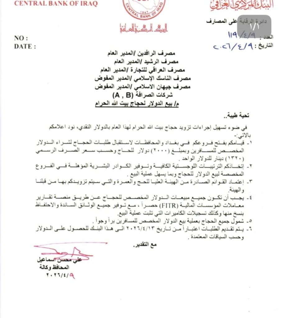 وشدد البنك، في وثيقة رسمية، على ضرورة اتخاذ الإجراءات اللوجستية اللازمة كافة، بما في ذلك توفير الكوادر المؤهلة لضمان انسيابية عملية بيع الدولار للحجاج وتسهيلها.