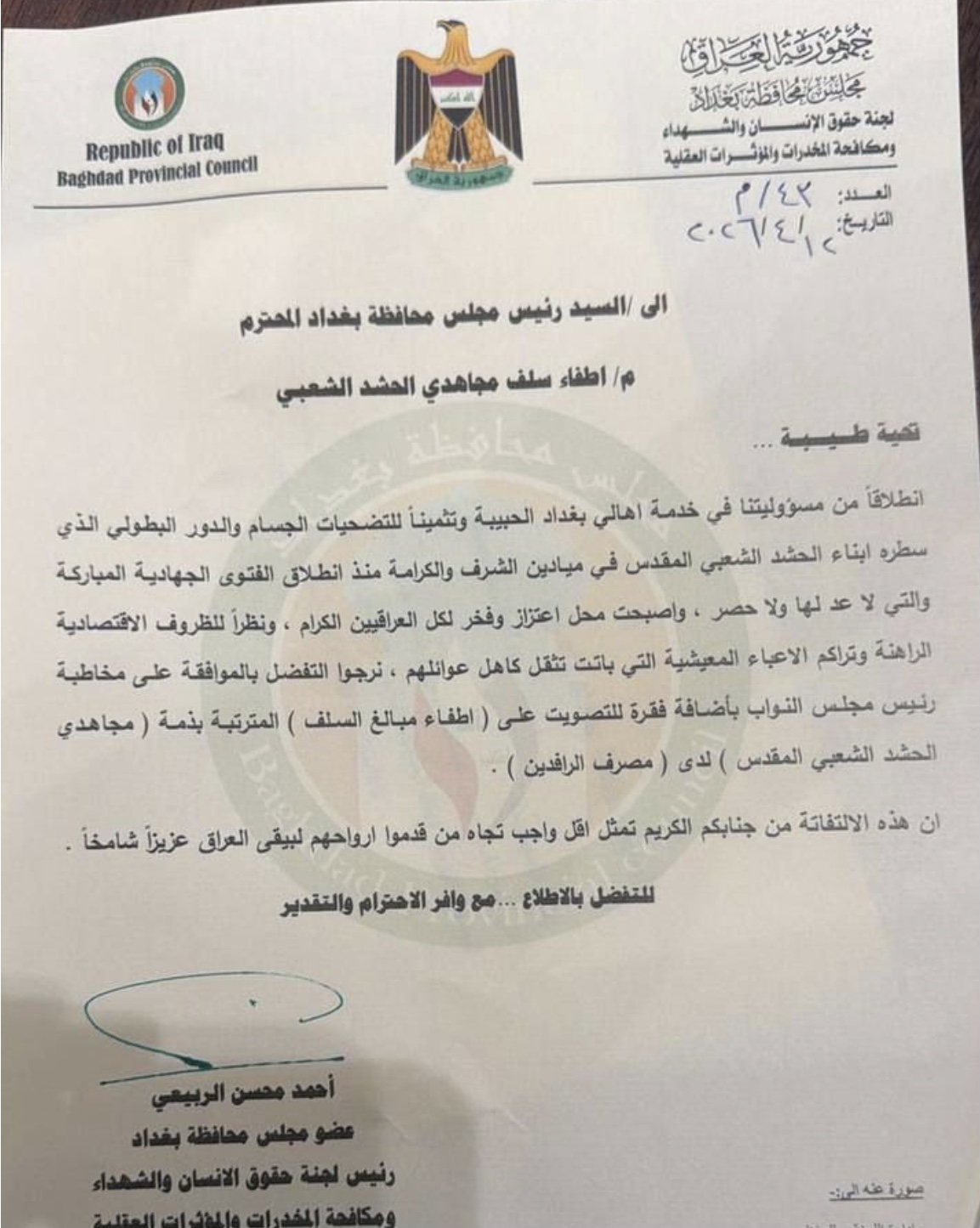 مجلس بغداد يدعو لمخاطبة البرلمان لإطفاء سلف مقاتلي الحشد الشعبي الأحد, 12 أبريل 2026, 16:50 محليات, يحدث الان دعا مجلس محافظة بغداد، اليوم الاحد، إلى مخاطبة رئاسة مجلس النواب لإضافة فقرة التصويت على اطفاء سلف مقاتلي الحشد الشعبي. Screenshot تابعونا عبر تليغرام
