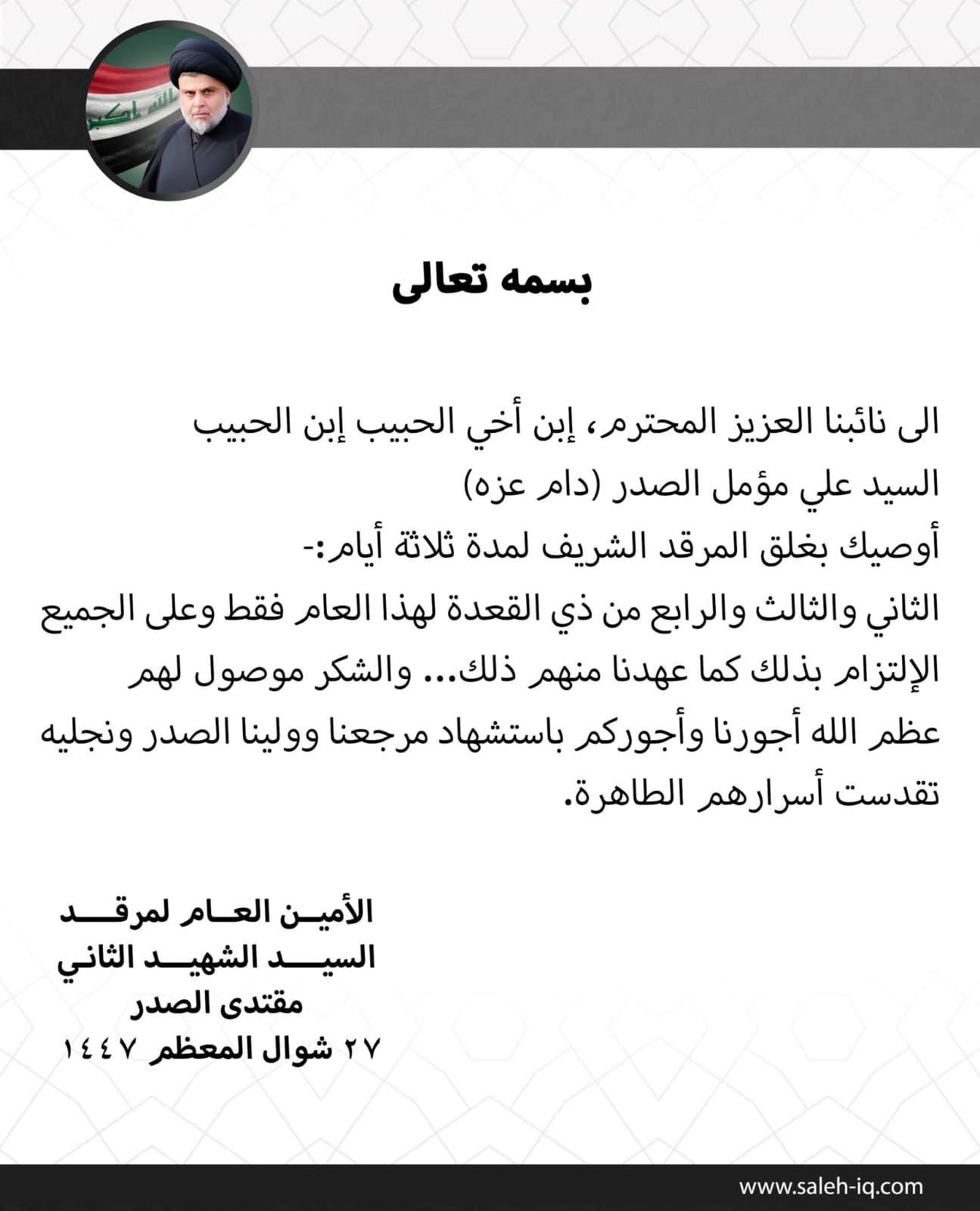 السيد الصدر يوجه بغلق مرقد والده السيد الشهيد الصدر في ذكرى استشهاده لثلاثة أيام الأربعاء, 15 أبريل 2026, 22:40 محليات, يحدث الان تابعونا عبر تليغرام