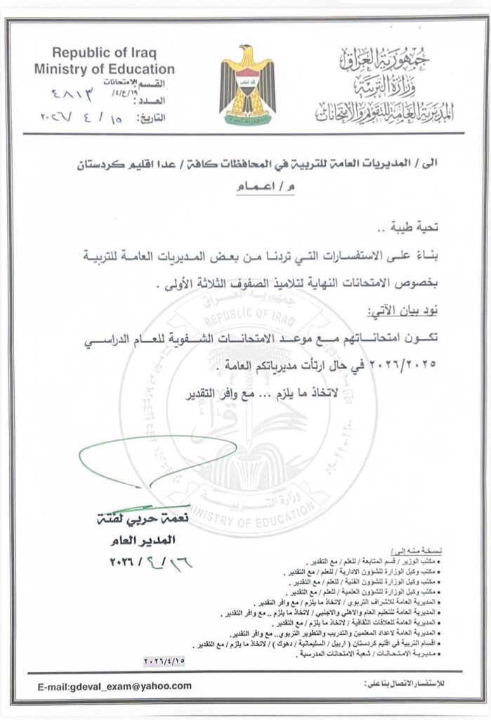 أعلنت وزارة التربية، اليوم الخميس، عن منح المديريات العامة للتربية صلاحية تحديد مواعيد امتحانات الصفوف الثلاثة الأولى، بما ينسجم مع ظروف كل مديرية واحتياجاتها التنظيمية.