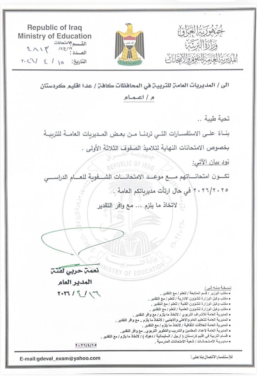 وأضاف أن “هذا التوضيح جاء بناءً على الاستفسارات الواردة من بعض المديريات العامة للتربية بشأن الامتحانات النهائية لتلاميذ الصفوف الثلاثة الأولى”.