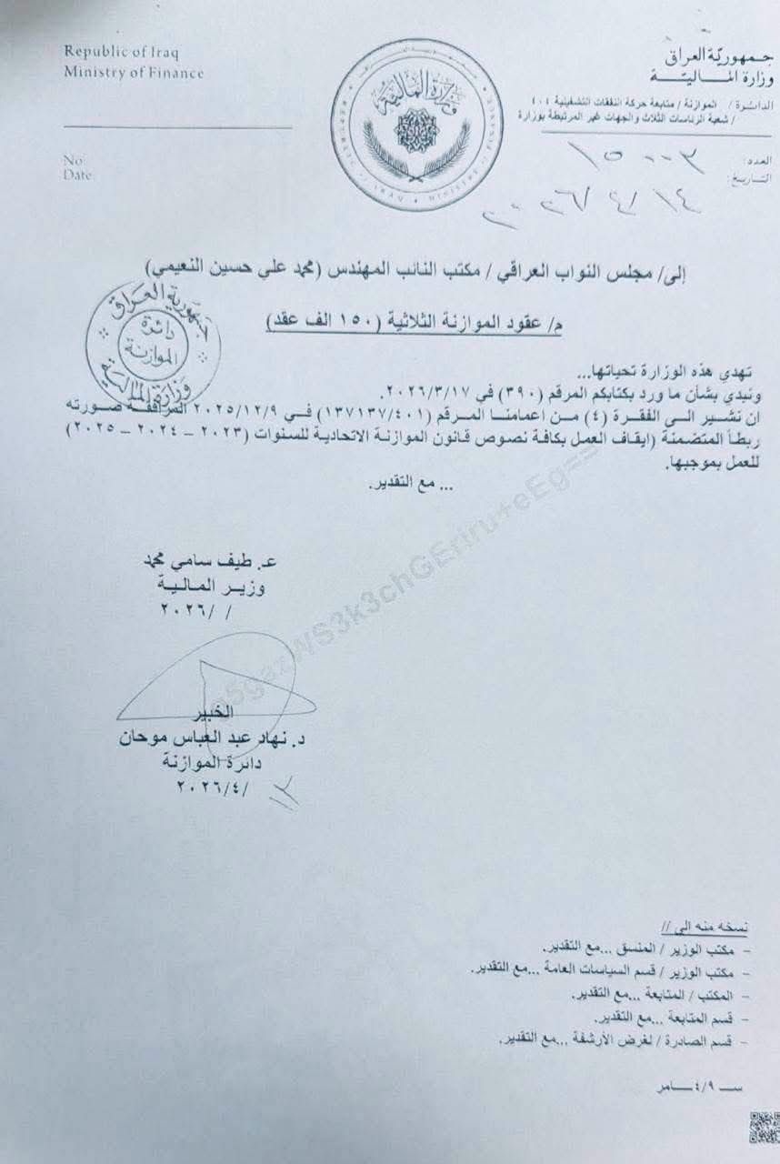 كشفت وثيقة صادرة عن وزارة المالية/ دائرة الموازنة، وموجهة إلى مكتب النائب محمد علي حسين النعيمي، عن إيقاف العمل بكافة نصوص قانون الموازنة الاتحادية للسنوات (2023 – 2024 – 2025) المتعلقة بـ “عقود الموازنة الثلاثية” الـ “150 ألف عقد”.