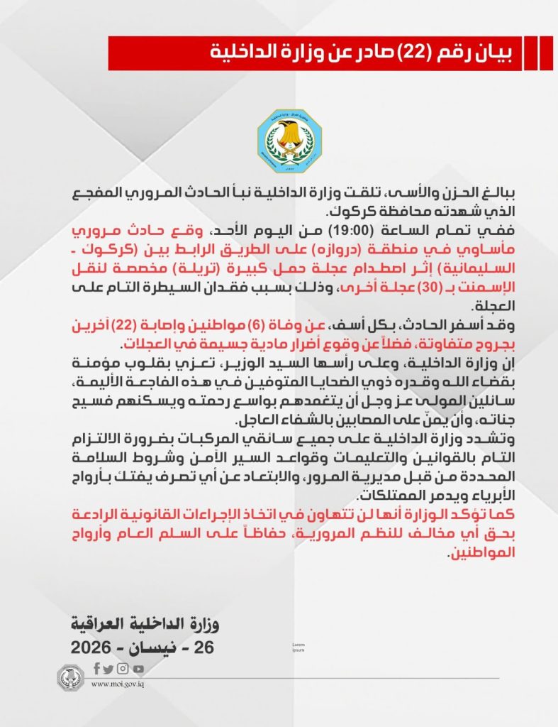 الداخلية تصدر بيانا بشأن الحادث المروري المفجع كركوك الأحد, 26 أبريل 2026, 23:59 محليات, يحدث الان تابعونا عبر تليغرام